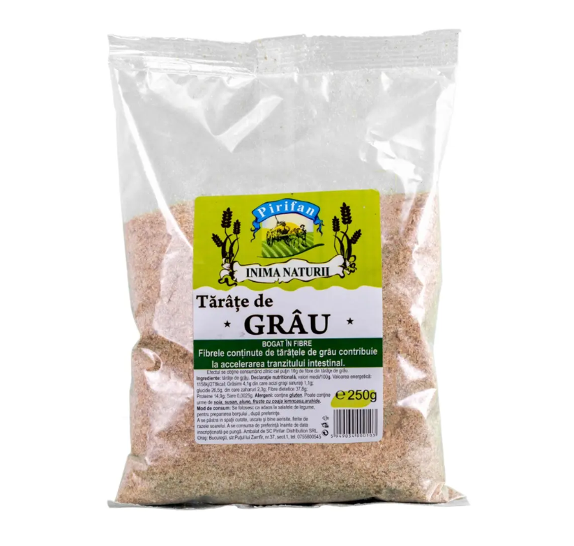 Taratele de grau Pirifan, disponibile in ambalaj de 250 g, sunt o sursa bogata de fibre, vitamine si minerale, avand beneficii importante pentru sanatate. Acestea contribuie la digestie sanatoasa, oferind un efect emolient asupra stomacului si intestinelor.
