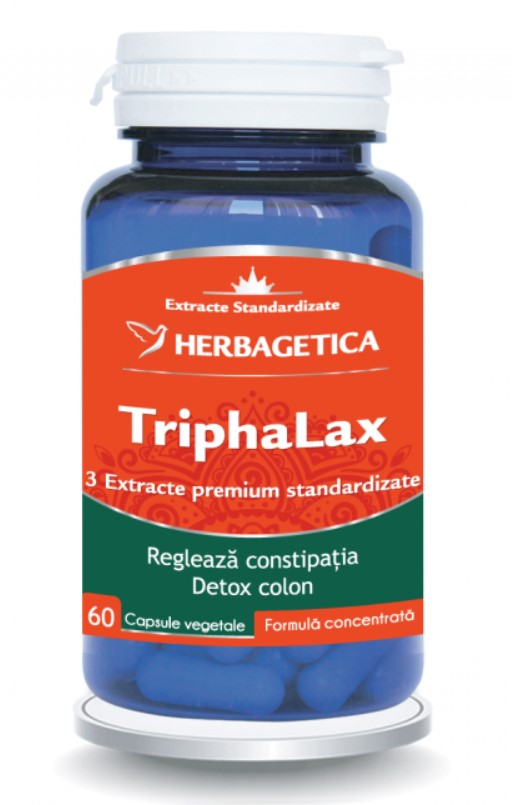 TriphaLax, 60 capsule, produs de Herbagetica, Romania, regleaza constipatia, avand un efect bland laxativ, detoxifica colonul, este imunostimulator si rejuvenant. TriphaLax contine extract de Triphala standardizat cu 40% taninuri cu efect bland laxativ, care detoxifiaza organismul si curata intreg tractul gastrointestinal, imbunatatind digestia si sustinand absorbtia nutrientilor la nivelul intestinelor. Contribuie la eliminarea toxinelor si a depozitelor de grasime din intestine.