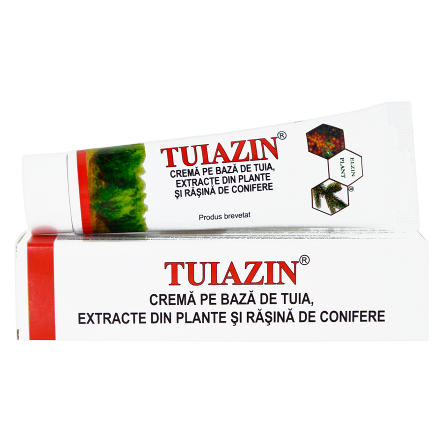 Tuiazin Crema cu Extract Tuia de la Elzin Plant pe baza de tuia, extracte din plante si rasina de conifere. Tratament noduli, bolir de piele, papiloame.