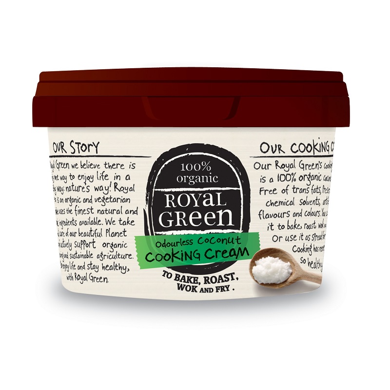 Uleiul-crema de cocos pentru gatit, 500 ml, produs de Royal Green, Olanda, este un ulei de cocos 100% certificat organic, cu puritate controlata, inodor (aroma neutra), de cea mai inalta calitate. Uleiul isi pastreaza toate calitatile atunci cand este incalzit. Provine din plantatii de cocos sustenabile.