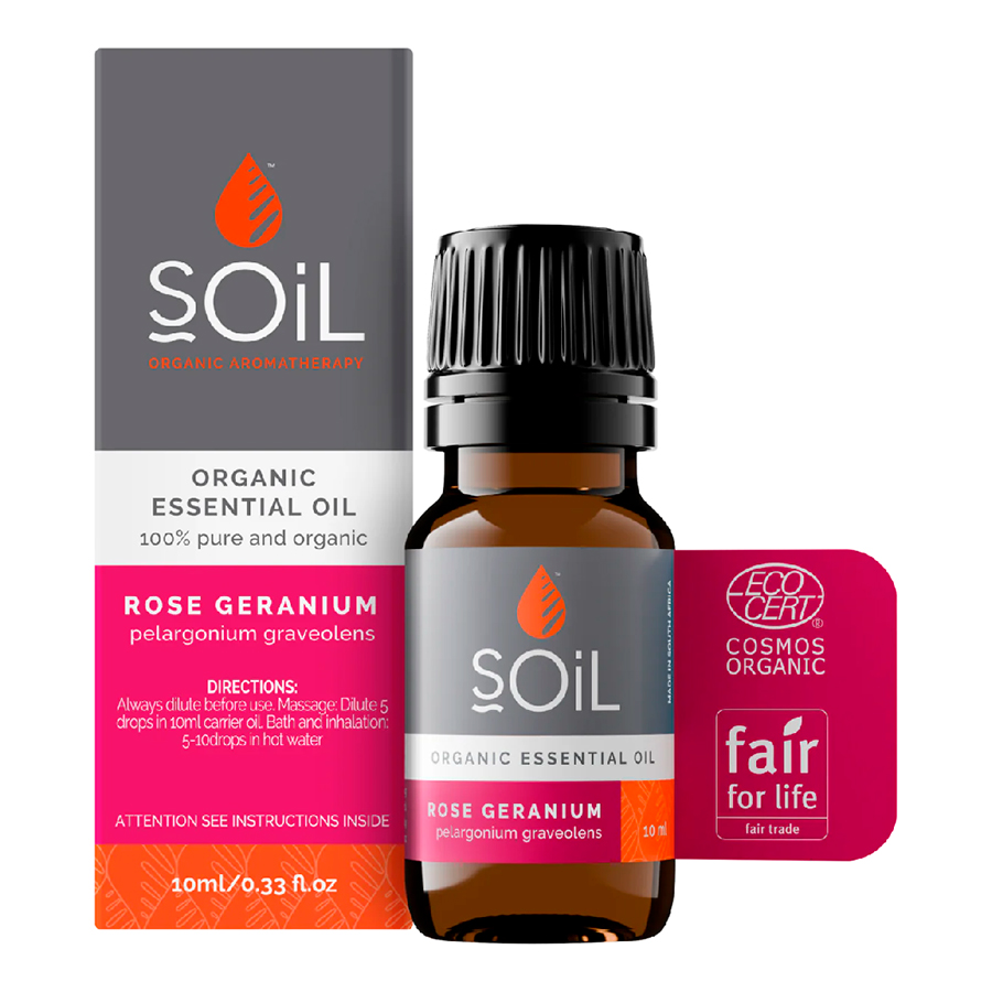 SOiL Ulei Esential Muscata-trandafir (Pelargonium graveolens) Pur Organic ECOCERT 10 ml este un produs 100% Certificat Organic si nu contine SLS, uleiuri minerale, parabeni, coloranti artificiali, parfum artificial sau silicon. Nu este diluat.