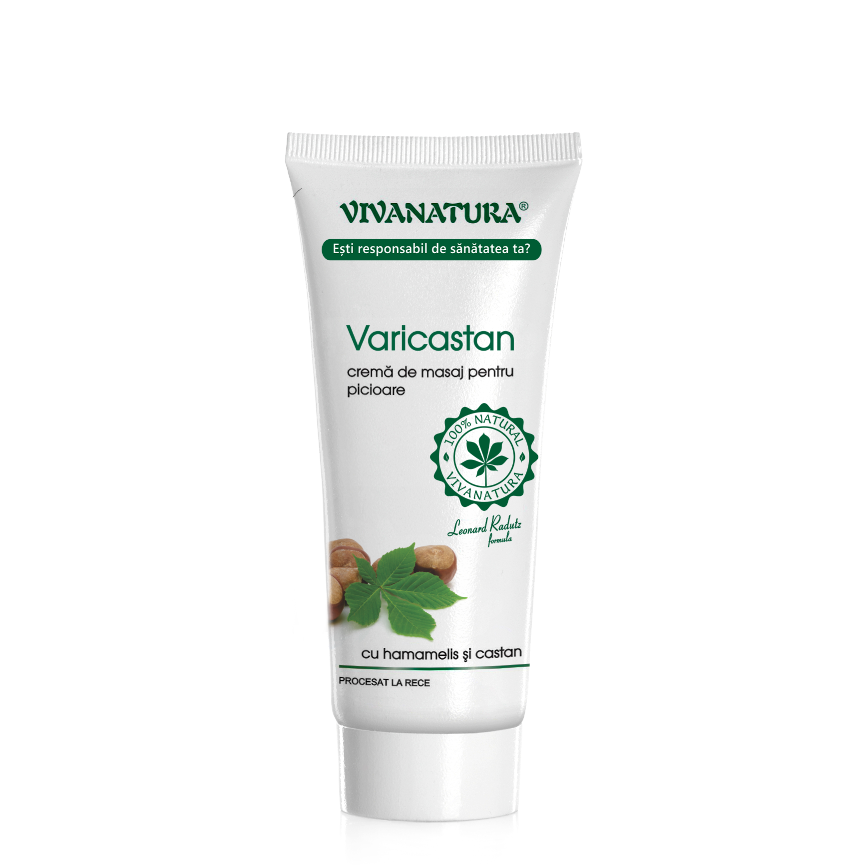 Crema Varicastan, 75 ml, produsa de VivaNatura, Romania, este o crema pentru masajul picioarelor, cu hamamelis si castan, 100% din ingrediente de origine naturala. Este recomandata persoanelor cu circulatie periferica deficitara si varice.