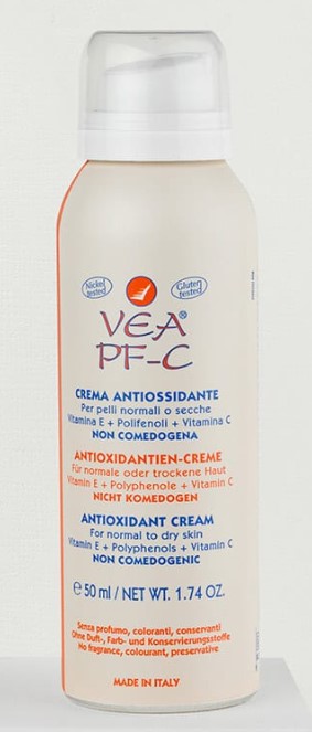 Crema antioxidanta pentru ten normal si uscat VEA PF-C, 50 ml, Hulka, Italia, este o combinatia avansata de vitamina E intr-un procent ridicat si un extract standardizat de polifenoli din samburi de struguri si ceai verde.