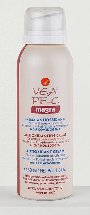 Crema antioxidanta pentru ten combinat si gras VEA PF-C Magra, 50 ml, Hulka, Italia, este o combinatia avansata de vitamina E intr-un procent ridicat si un extract standardizat de polifenoli din samburi de struguri si ceai verde.