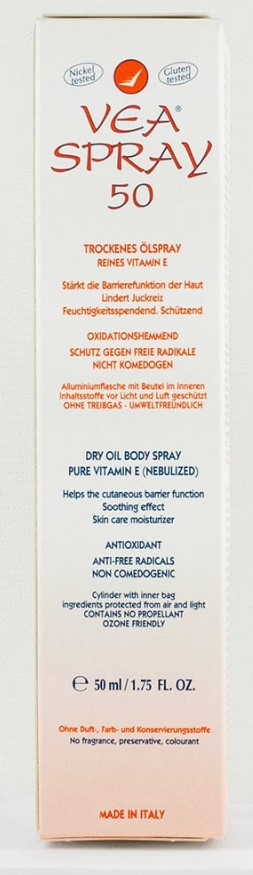 Spray VEA Spray 50, 50 ml, Hulka, Italia, este un spray corporal cu ulei uscat. Produsul este destinat pielii delicate si sensibile, avand efecte de calmare a uscaciunii cutanate, rosetii si mancarimii, inclusiv pe suprafetele mari si pilifere ale pielii.