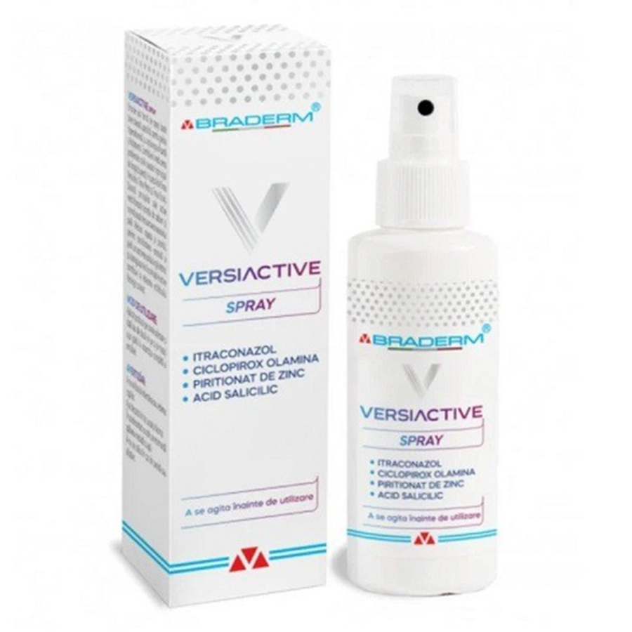 Versiactive spray este unicul preparat topic pe baza de Itraconazol, un antimicotic cu spectru larg de generatie mai noua, in combinatie cu alte ingrediente active precum Ciclopirox olamina.