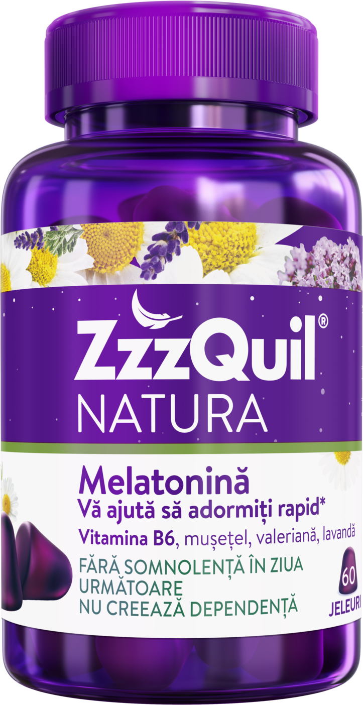 ZZZQuil NATURA este un supliment alimentar pentru somn care te ajuta sa adormi mai repede*. Dormi suficient in timpul noptii, pentru a te trezi fresh a doua zi. ZZZQuil NATURA are o formula cu extracte pe baza de plante si melatonina, un hormon care se gaseste in mod natural in organism, care te ajuta sa-ti reglezi ciclul natural de somn si sa adormi mai repede. Fara somnolenta in ziua urmatoare: cu doar 1 mg de melatonina, 1,4 mg de vitamina B6 si un amestec de extracte naturale din plante pentru a adormi mai usor, dar fara senzatia de ameteala de a doua zi.